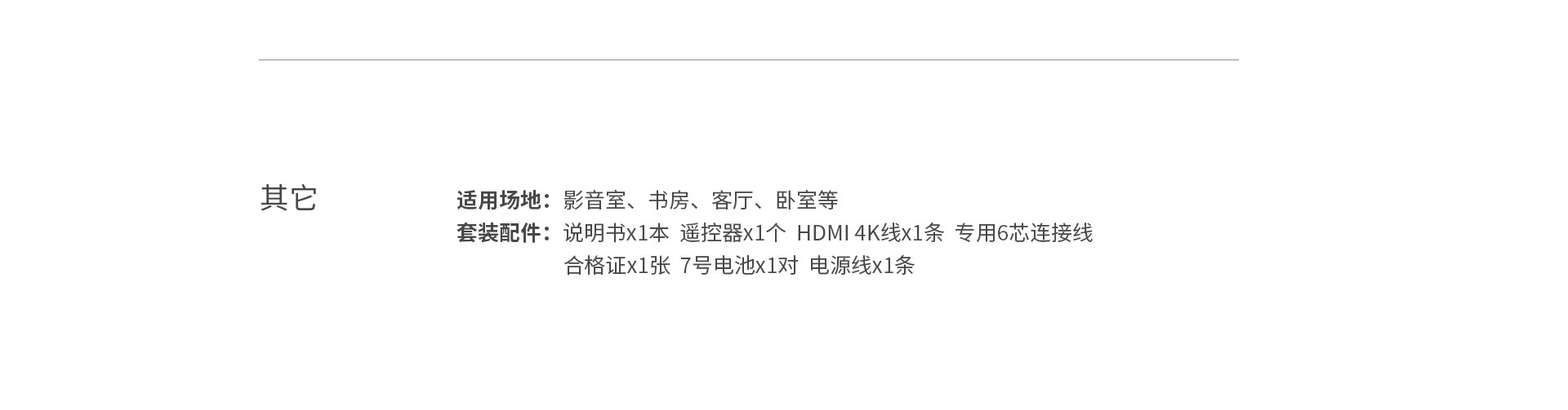 套装配件:说明书×1本、遥控器×1个、HDMI 4K线×1条 合格证×1张、7号电池×1对、电源线×1条、主音箱连接线×1对