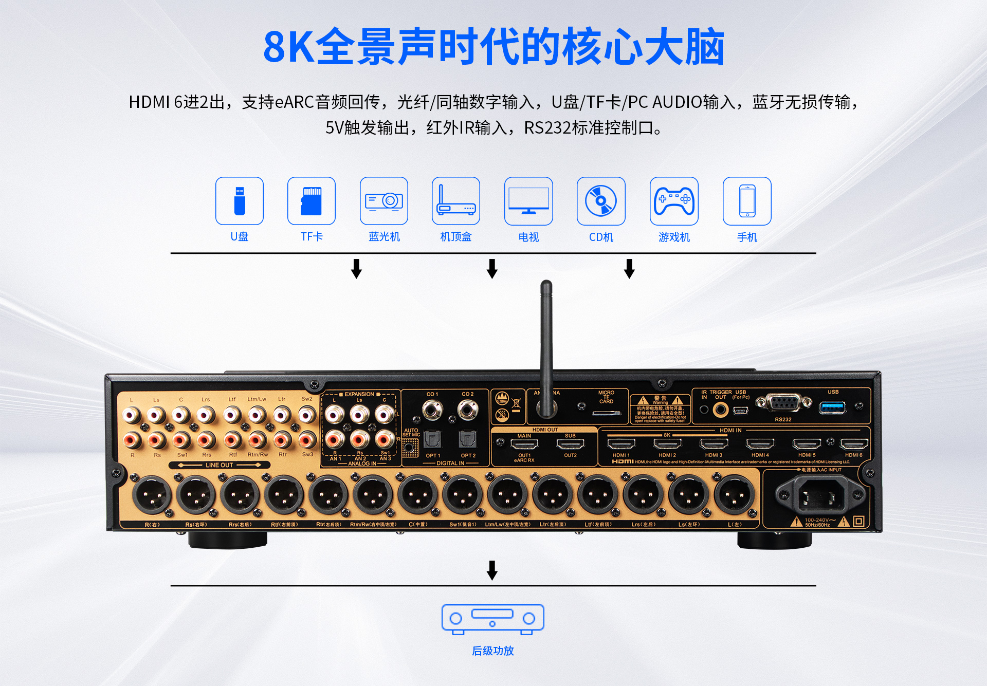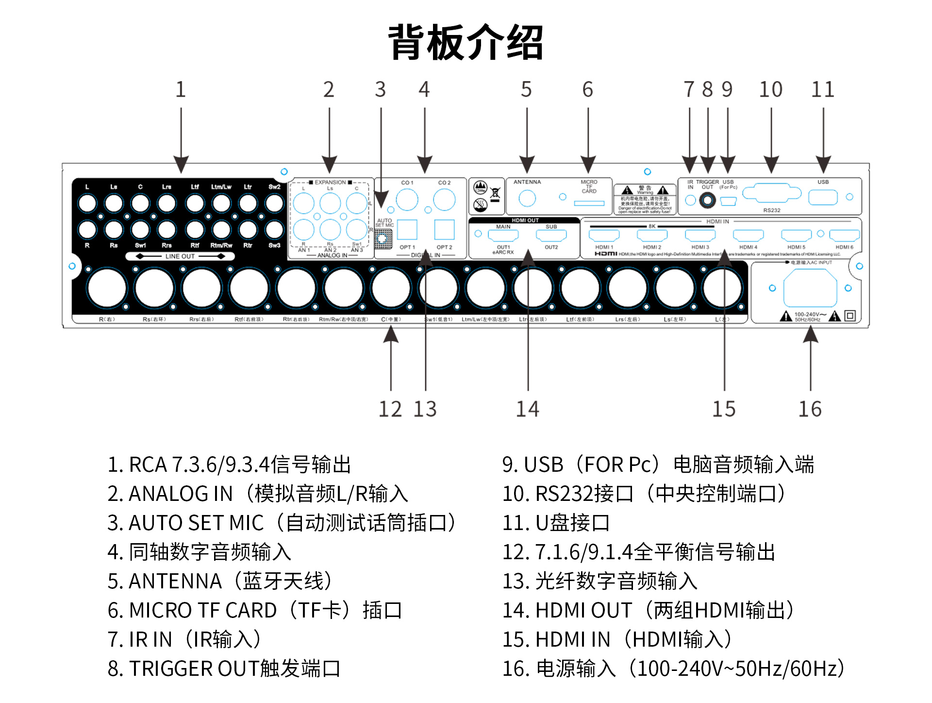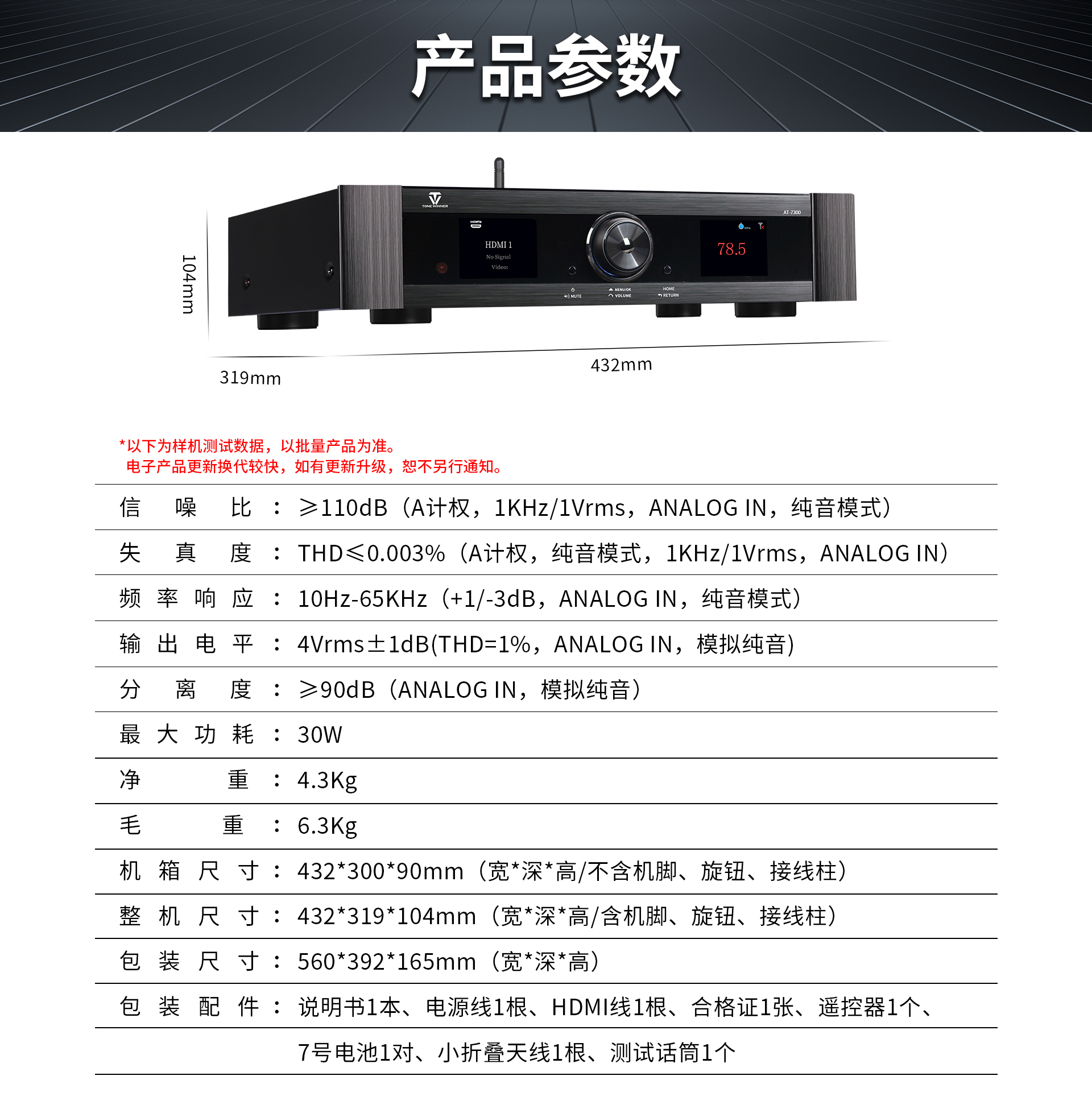 | 包装配件:说明书1本、电源线1根、HDMI线1根、合格证1张、遥控器1个、 7号电池1对、小折叠天线1根、测试话筒1个 | 其他:/ |