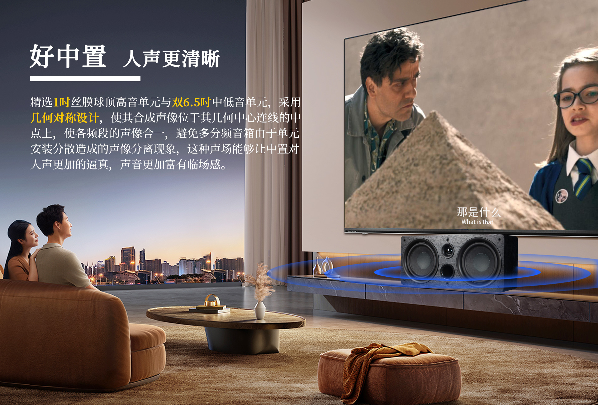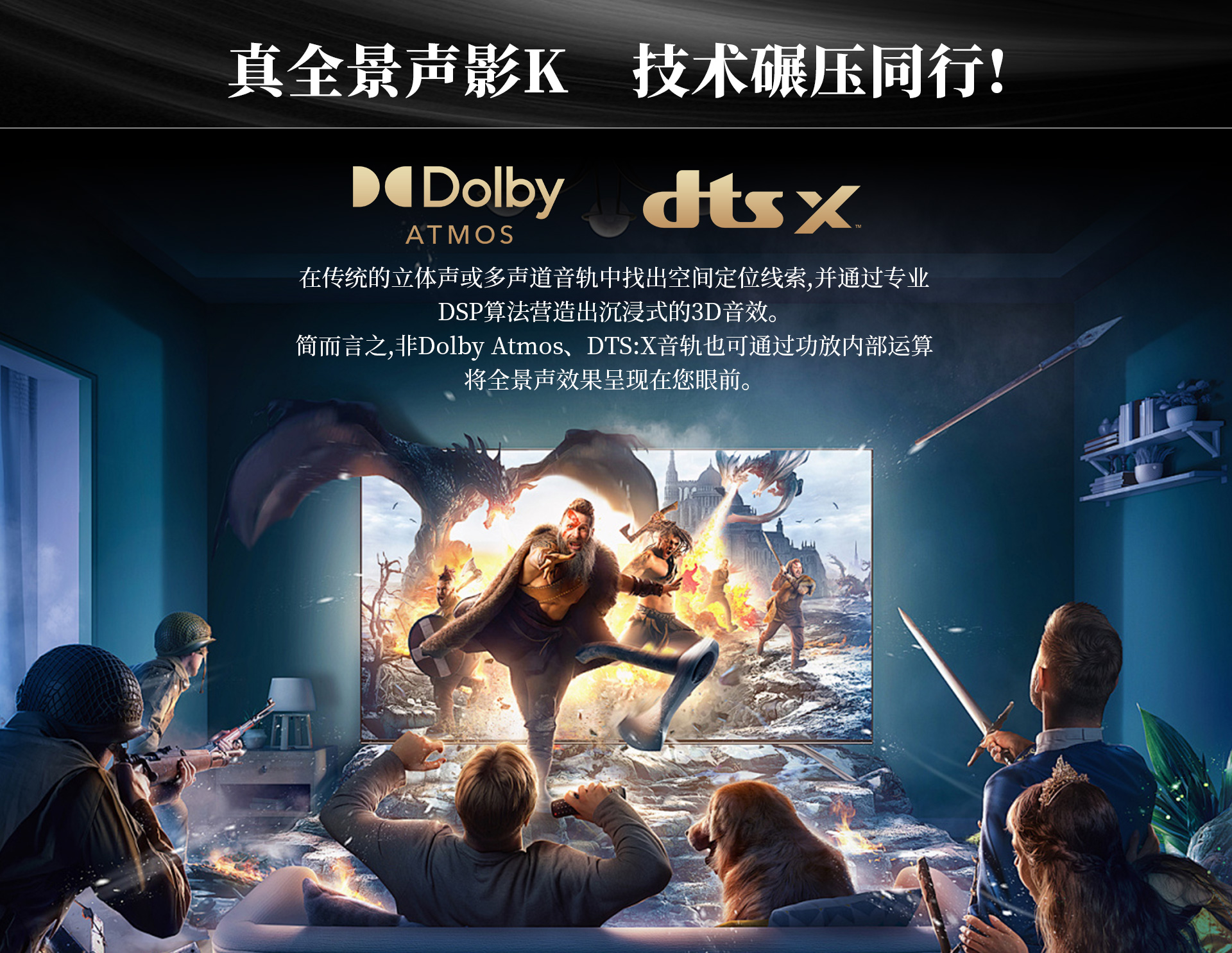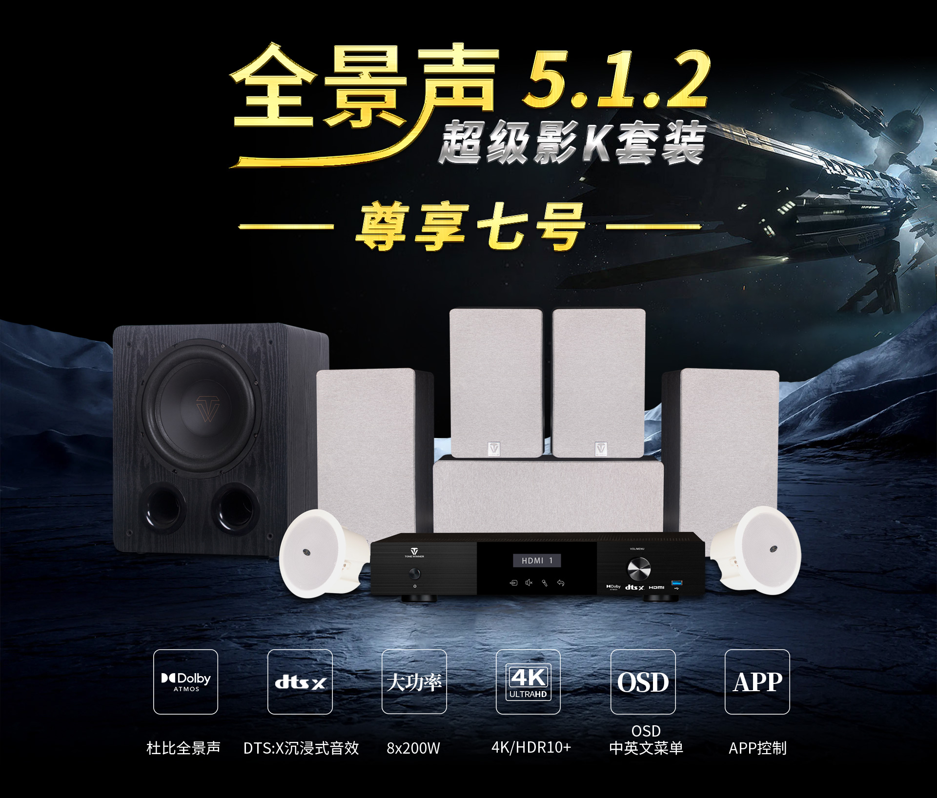 三、声音特点 尊享七号的5.1.2全景声影K系统通过构建360°三维立体空间,打造全方位包裹感,让人沉浸其中。各声效定位精准、层次分明,战争片中爆炸、建筑坍塌等大动态场景的驾驭都游刃有余、低频下潜深厚且富有弹性,中频人声保持清晰有力通透质感,金属的摩擦声、玻璃的脆裂声等环境音处理更是细腻真实,每个细节都能够勾勒出强烈的画面感,构建出极具冲击力、沉浸真实的观影现场。