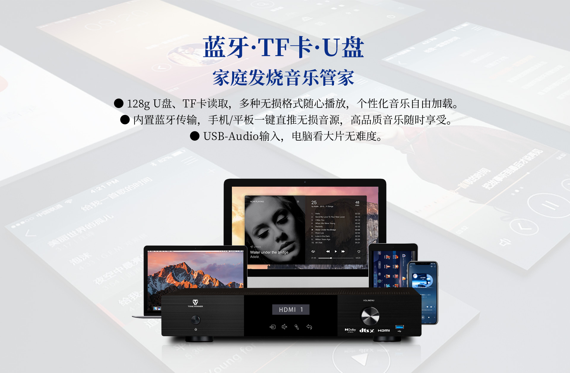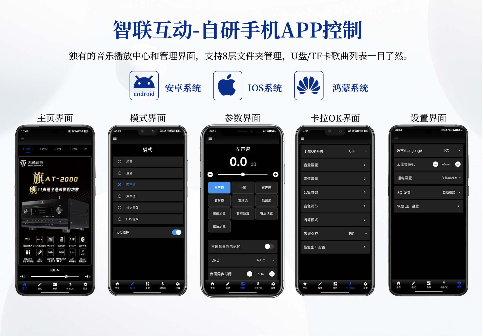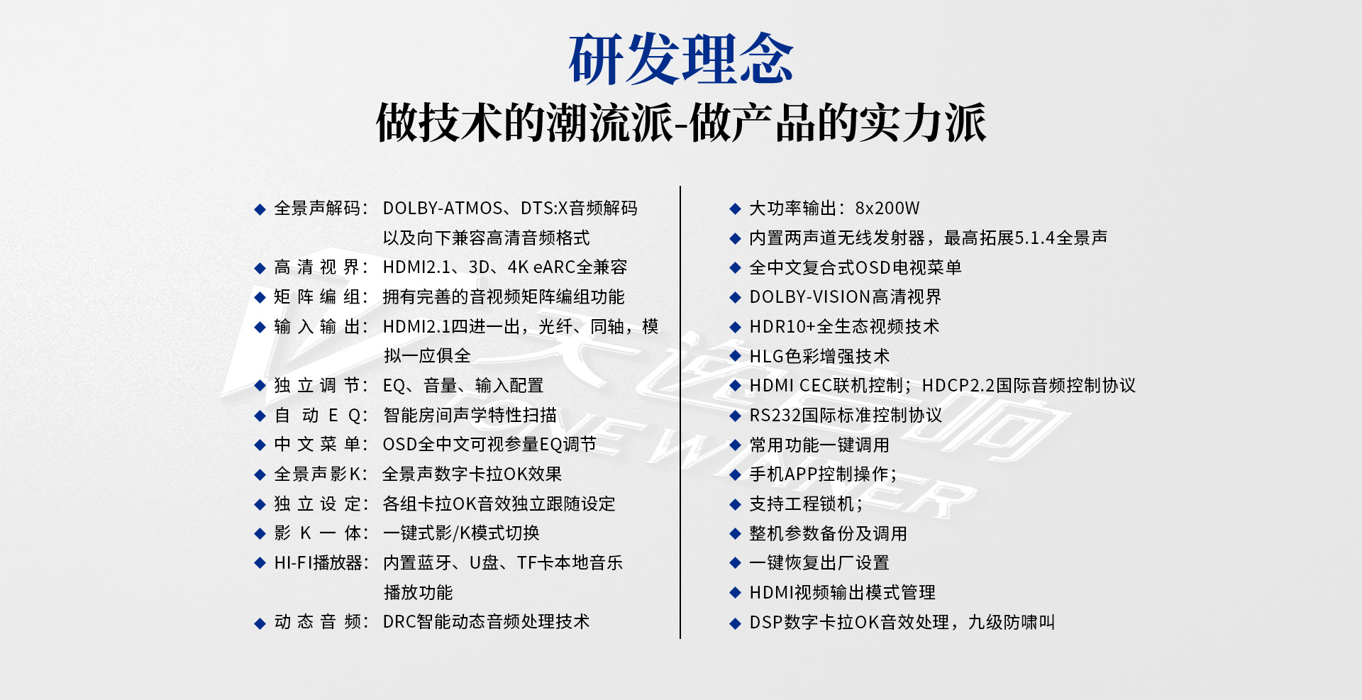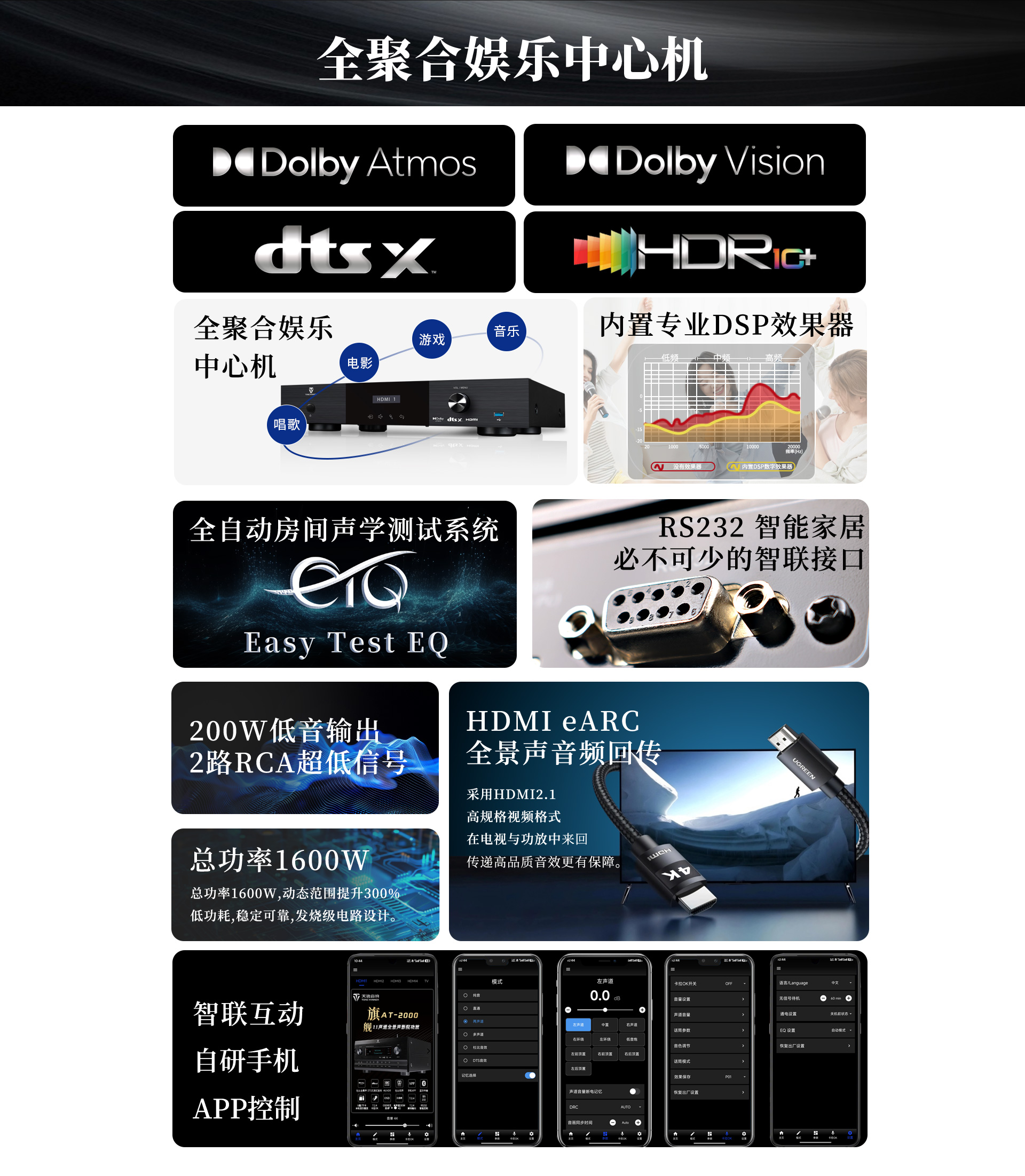 二、功能特性 1、支持DolbyAtmos、DolbyTrue-HD及向下兼容所有杜比音频编码文件; 2、支持DTS:X、DTS-Master及向下兼容所有DTS音频编码文件; 3、支持HDMI2.1,支持HDCP2.2加密协议; 4、支持3D立体电影,支持4K/60HZ,RGB4:4:4等格式; 5、支持Dolby Vision及HDR 10+超高清视频信号; 6、多声道沉浸式卡拉OK体验,预设多种演唱风格; 7、支持HDMI eARC音频回传;支持CEC控制; 8、支持HDMI4进1出,光纤、同轴接口一应俱全; 9、内置全球五大测试系统之--ETQ房间声学自动测试校正软件; 10、支持蓝牙/U盘/TF卡无损音乐播放,支持手机APP操作; 11、内置8声道大功率输出,总输出功率高达1600W; 12、支持RS232智能控制; 13、支持OSD全中文菜单操作显示,画中画可视调整更直观; 14、支持按输入源独立设置及保存参数的功能; 15、支持音视频混搭编组; 16、开关机状态记忆功能; 17、支持整机参数备份及调用; 18、支持用户参数保存及调用设置; 19、7~11段参数EQ满足个性声音喜好调节; 20、内置多种观影模式及K歌模式,轻松调用; 21、预设多种扬声器布局方式,一键调用,轻松设置; 22、面板简洁时尚,触摸式样功能键。