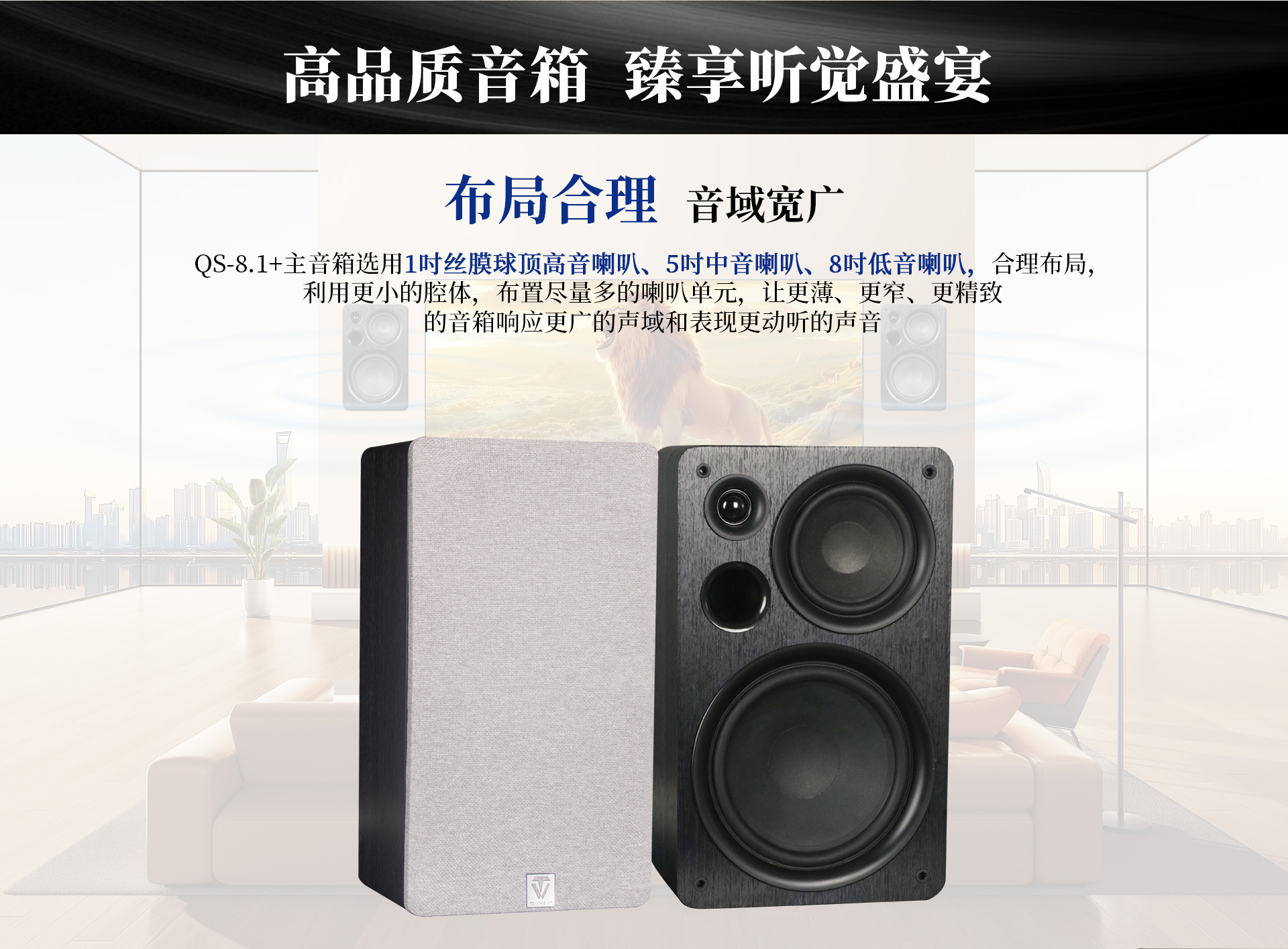 型号:QS-8.1+ 喇叭配置:1"+5"+8" 箱体结构:低频反射式 额定阻抗:8Ω 频率范围:50-20k Hz 功率范围:70-200W 灵敏度:86±3dB 净重:约6.5kg/只 毛重:约14.5kg/对 音响尺寸:244x400x150mm(WxHxD)含网罩 包装尺寸:326x487x395mm(WxHxD)