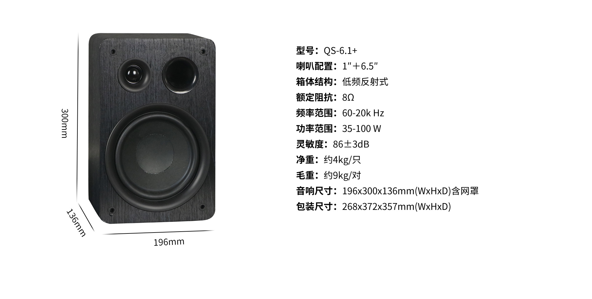 型号:QS-6.1+ 喇叭配置:1"+6.5'' 箱体结构:低频反射式 额定阻抗:8Ω 频率范围:60-20k HZ 功率范围:35-100W 灵敏度:86±3dB 净重:约4kg/只 毛重:约9kg/对 音响尺寸:196x300x136mm(WxHxD)含网罩 包装尺寸:268x372x357mm(WxHxD)