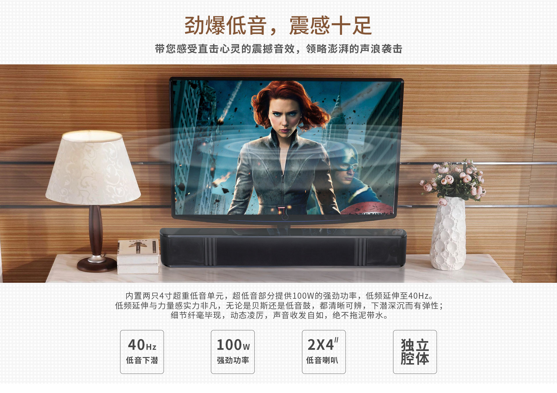三、主要功能表述 精巧按钮,品质源于细节:面板按键极少,五个精致圆形按键成环形排列,简洁自然!功放的主要功能可以通过精巧的按钮操控来实现。按钮与简洁洗练的面板融为一体,体现出设计师对于简约型和易用性的追求。 便捷设计中文显示,操作简单:2.8寸宽屏TFT彩屏显采示器,图形化操作界面,显示更细腻。全中文菜单,简单明了,操作方便外行也可快速上手。 单线缆连接,告别杂乱无章: 功放与音箱单线缆连接。只需一根多芯无氧铜铜线,就可以与音箱连接,无需与传统的家庭影院般的复杂走线,将连线缩减到一根,告别杂乱连线,即可还您干净整洁的家居环境。 精巧遥控,轻松惬意一手掌:配备小巧精致的红外接收遥控。纯黑色细腻拉丝工艺,柔软灵敏的橡胶按钮,触感细腻,手感极佳。可长距离,大范围接收信号,反应迅速,使用方便。 简约而不简单,不同材质的碰撞与融合:Soundbar两端采用一体式细孔金属网罩,中间高音部分采用布面网罩,箱体部分为黑色高亮烤漆。相同颜色,不同材质的碰撞与融合,形成不一样的设计风格,简约而不简单。
