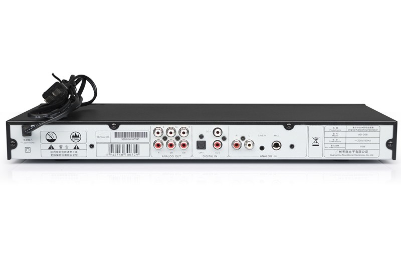 一、产品介绍 AD-308是天逸近年推出的一款高性能、多功能卡拉OK效果器,采用专业级DSP数字处理,内置高反馈抑制模块,9级数字防啸叫,让音质更纯净,演唱更轻松。支持3.5mm、模拟、同轴和光纤等音源输入,5.1卡拉OK输出接口。更专业的设计,满足你的个性化需求,“将KTV搬回家。” 二、功能介绍 1、专业DSP卡拉OK算法,多种话筒音效调节。 2、9级数字防啸叫,音质更纯净。 3、支持3.5mm、模拟、同轴和光纤等音源输入。 4、多功能红外遥控器。 5、支持3路话筒输入(2组有线,1组无线) 三、产品性能参数 信噪比:音乐:≥80db (A计权);话筒::≥80db (A计权) 频响:音乐: 20Hz—20KHz;话筒: 20Hz-17KHz 增益:音乐: 15士3db 话筒: 35土3db 谐波失真:音乐:≤0.05% (A计权);话筒: ≤0.1% (A计权,正常工作条件下) 整机尺寸:431X51X199 mm 净重:1.8Kg 电源电压:~220V/50Hz 功耗:10W 随机附件:说明书X1本Q-431影音四头线X1条 遥控器X1个 电池X1对 合格证X1张 |