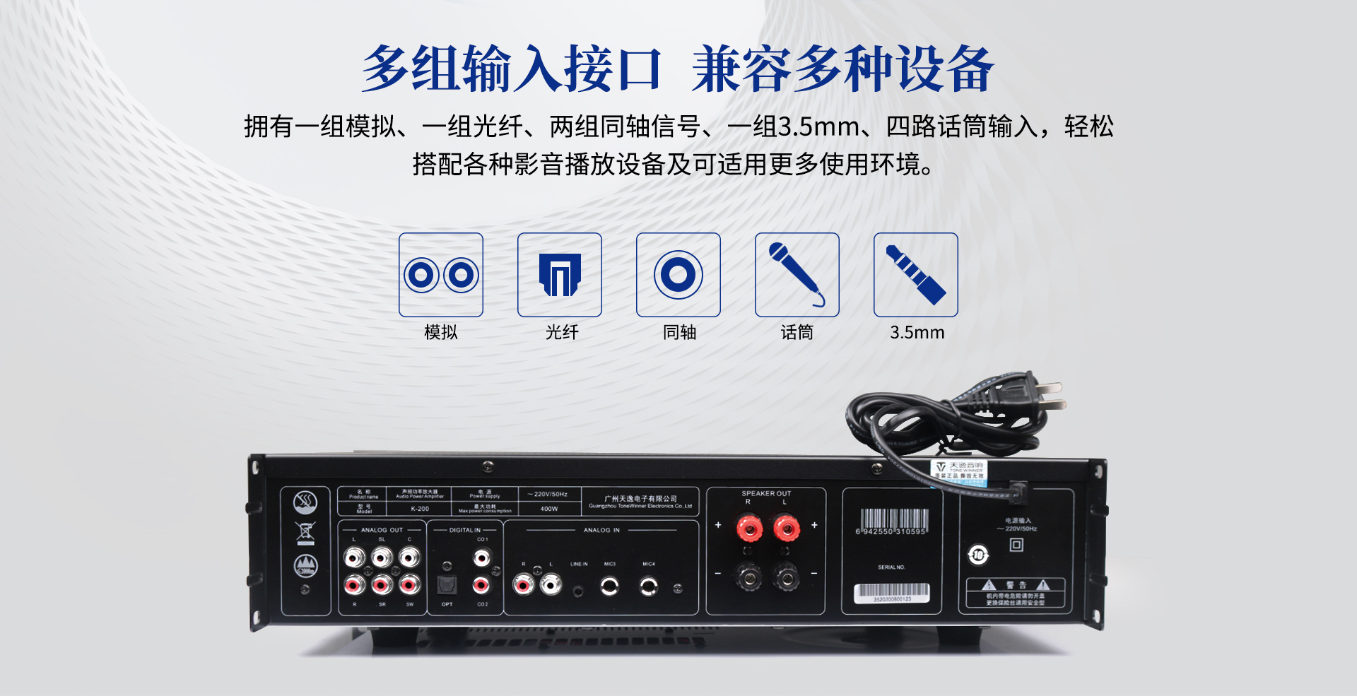 型号:K-200 信噪比:音乐:≥85dB(A计权);话筒:音乐:≥85dB(A计权) 谐波失真:音乐:≤0.05%(1KHz,正常工作条件);话筒:≤0.1%(1KHz,正常工作条件) 频率响应:音乐:20Hz~20KHz(+1dB/-3dB);话筒:20Hz~15KHz(+1dB/-3dB) 增益:音乐:≥40dB;话筒:音乐:≥60dB(额度工作条件)