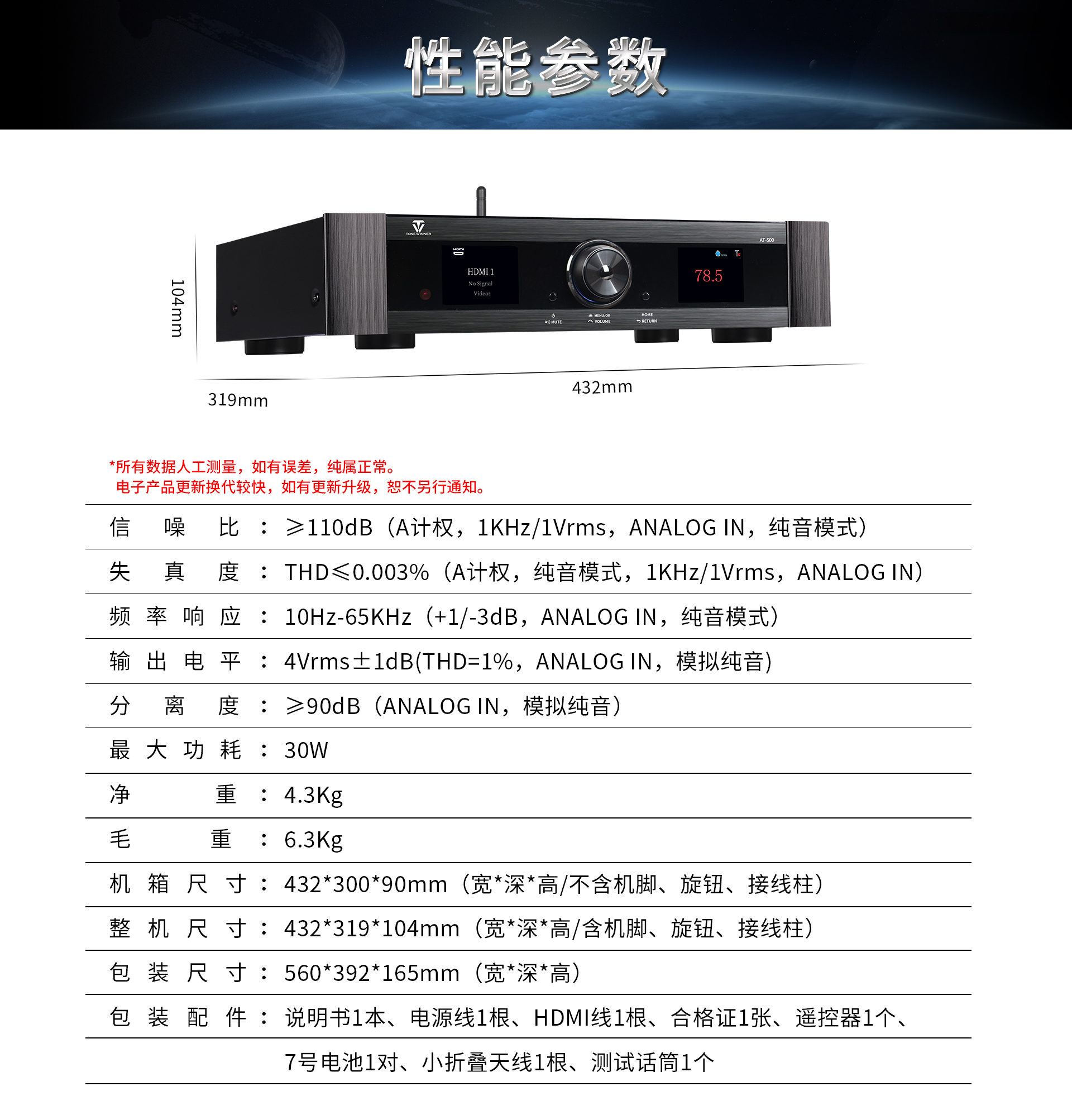 | 包装配件:说明书1本、电源线1根、HDMI线1根、合格证1张、遥控器1个、 7号电池1对、小折叠天线1根、测试话筒1个 | 其他:/ |