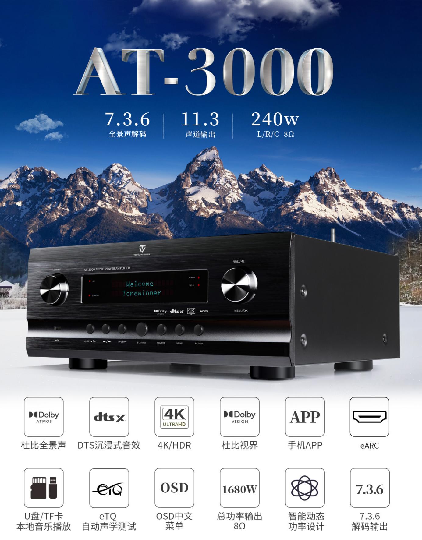 AT-3000同时支持9.3.4/7.3.6全景声解码输出,11声道最高可达1680W的功率输出。