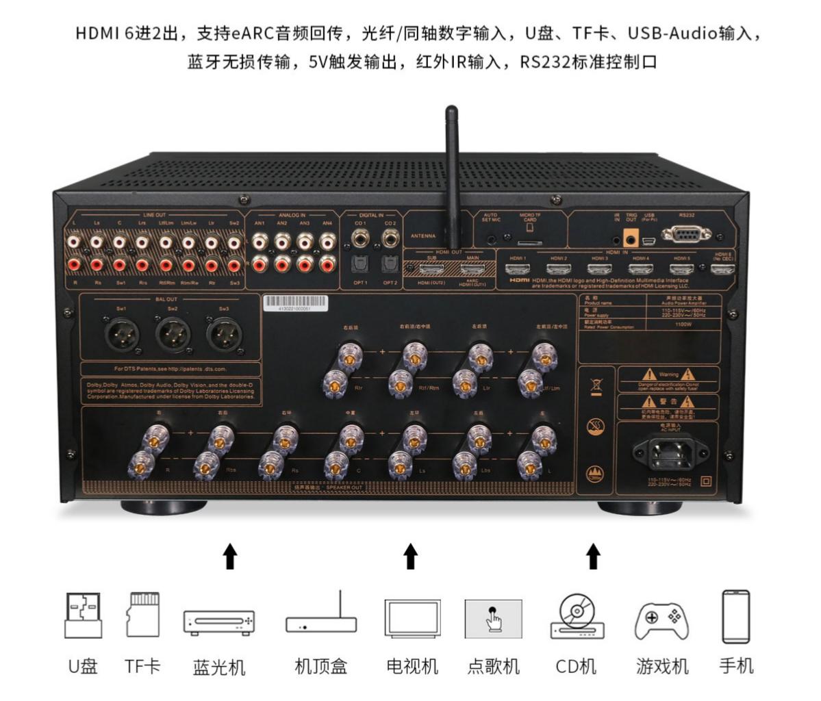 功放还配备一组HDMI e-ARC增强型音频回传,能支持无损与基于声音对象的音频传输(如Dolby Atmos与DTS:X格式)。同时支持U盘及TF卡本地播放,可播放多种无损音乐格式。