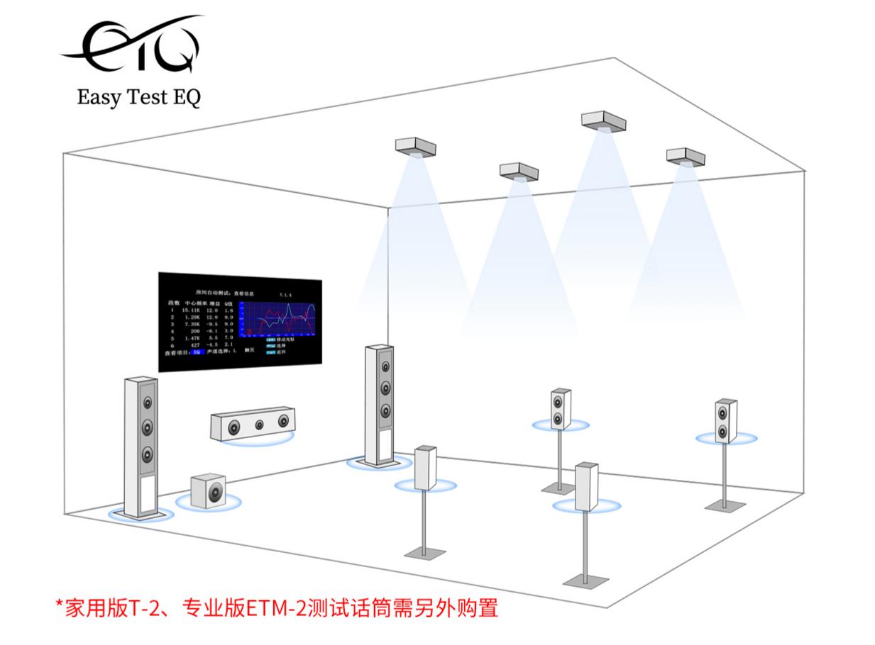 操作时,接入T-2测试话筒后打开菜单选择EQ调节,即可根据实际听音环境进行多维度测量,每声道多段EQ校正,使用简单,全程可视化操作。