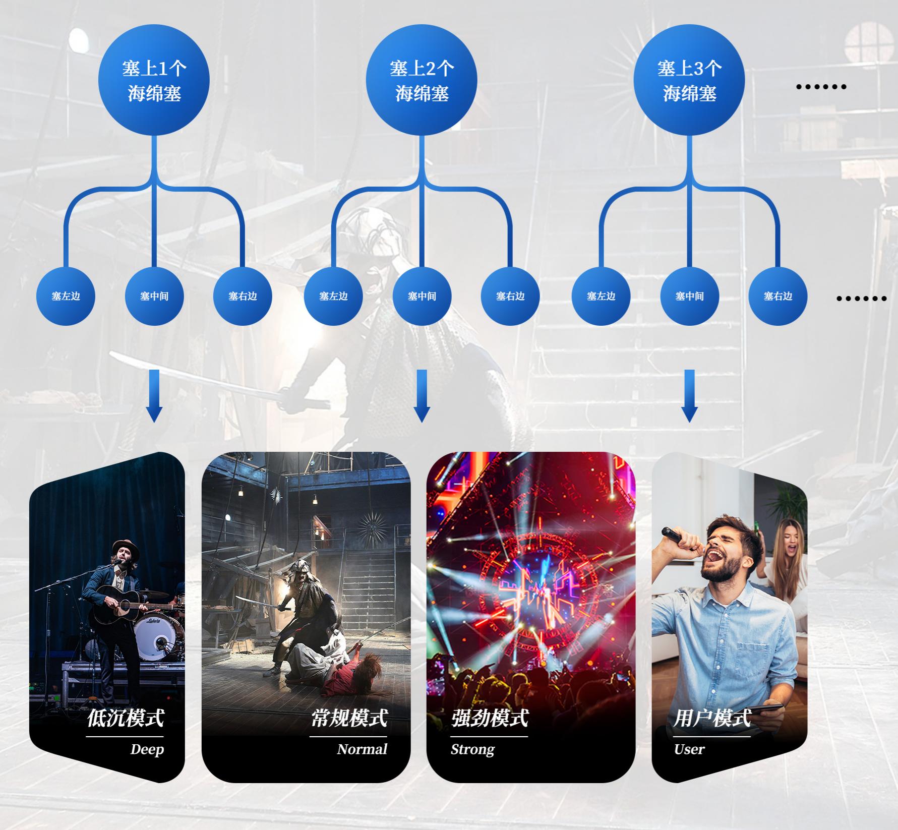 用户可以通过手机APP,设置倒相箱/闭箱两个模式。用户搭配特制的声学海绵塞,选择闭箱的个数和位置来优化声学效果。