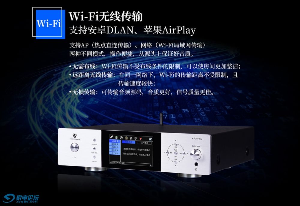此外,TY-i30PRO兼容安卓DLAN和苹果AirPlay技术,轻松实现跨平台音乐播放,借助庞大的无损音乐曲库,确保每一首歌都能实现无损的音频源码传输。