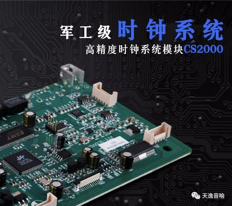 军工级时钟系统:为了让DAC芯片发挥出最强的性能,天逸特别定制一颗美国Cirrus Logic公司的顶级高精度时钟系统模块CS2000。此时钟系统采用可编程△—∑小数分频模拟PLL(锁相环)频率合成器,来稳定基准时钟的频率合成/时钟生成,在低至50Hz的频率下,生成比外部噪声同步时钟更低抖动的时钟。