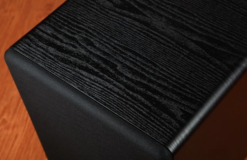 从正面看,能清晰看到圆孔前倒相式双筒设计:当低音炮发声时,手部靠近可明显感受到低频气流喷涌而出的冲击力!相比后倒相设计,其声音传播路径更短,听感强烈确切,量感也显著增强。再者,后倒相设计要离墙至少20厘米,否则低频反射过强,使得听感浑浊、质感模糊。而前倒相设计则不会有这种通病,摆位灵活,即使放在墙角或是靠墙摆放,也不影响低频效果,更有利于房间布局。