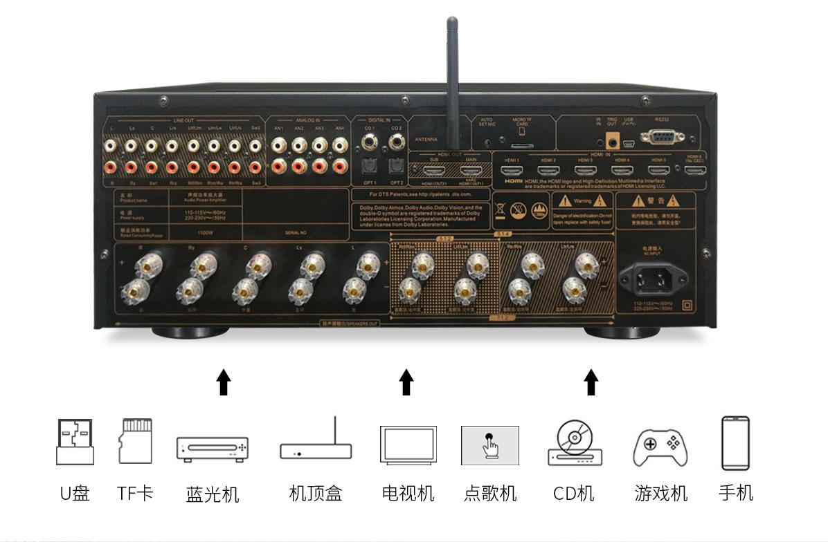 AT-2900支持128G U盘/TF卡本地播放,蓝牙无线传输与天逸专属APP操控,高保真音乐随心听。